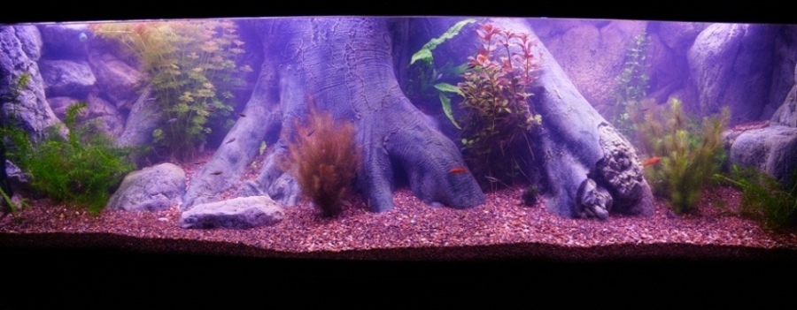 Það er töluvert pláss á bak við svona bakgrunn þarna eru sennilega 100 - 150 lítrar en lookið á búrinu vinnur það upp. Þarna á bakvið var ég í upphafi að hugsa um að setja bíófilter en þar sem ég er með tvær tunnudælur við búrið þá finnst mér að bíóflóran sé í fínu lagi. Svo núna ætla ég að hafa flotgróður þarna og blanda kolsýrunni í vatnið á bak við bakgrunninn en ég er að hugsa um plöntur sem eru duglegar að taka upp nitrat. Allar ábendingar vel þegnar.