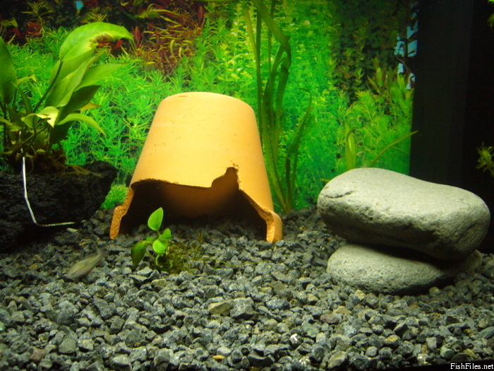 Ég er nokkuð sáttur við búrið. Hraunmolinn er holur við hornið þannig að það myndast hellir þar. Kallinn rak kerlinguna þangað um daginn og það virtist ekkert væsa um hana.